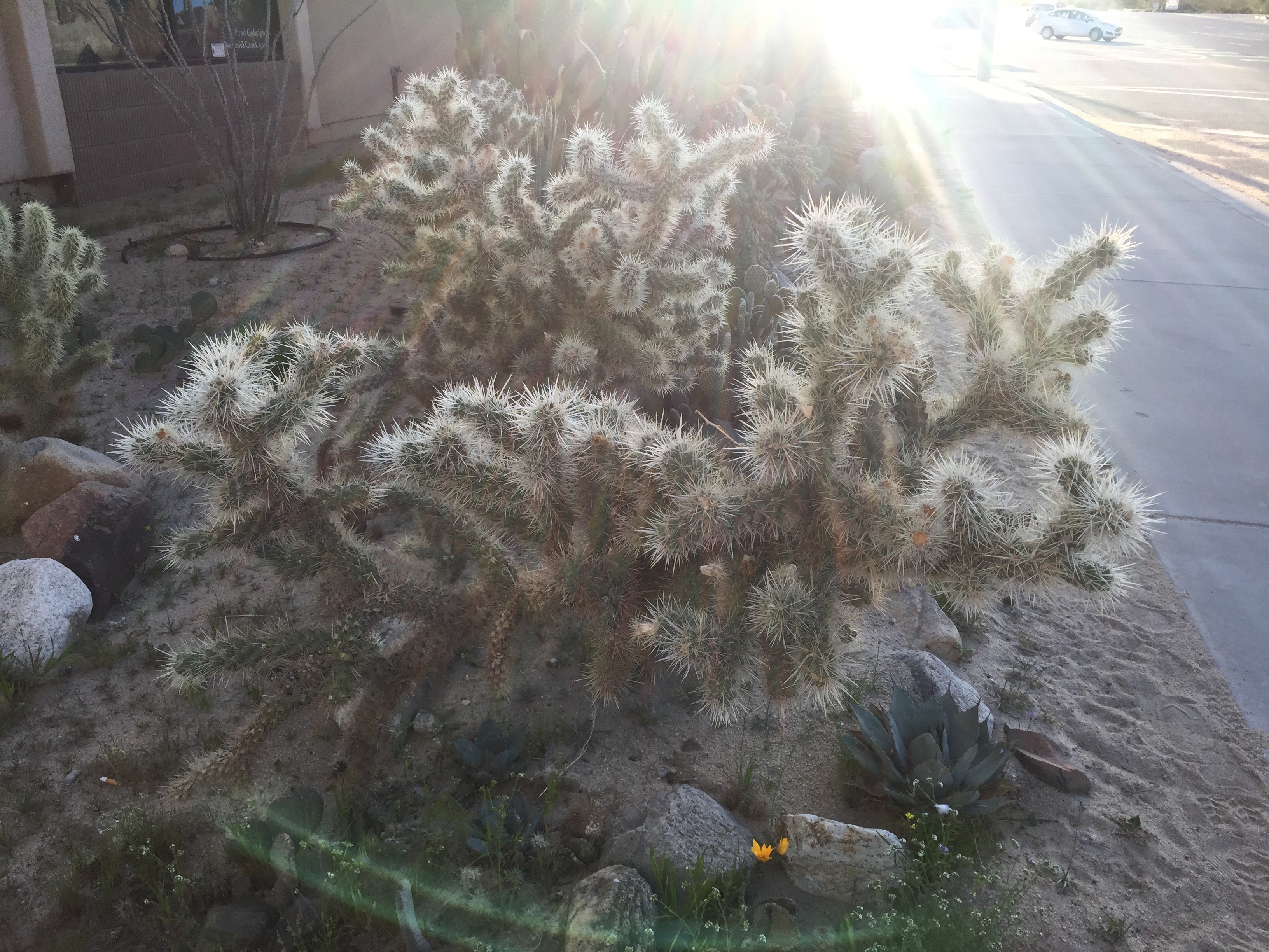 After mistakenly getting lunch at The Palms Café instead of Palm Greens Café (it was pretty good, though not what we expected) and getting groceries at the local Whole Foods (plus a fresh fruit smoothie since I was a zombie having been up for twelve hours since 3:30am) we made our way to Joshua Tree. Around the corner from our Airbnb on the way to dinner, I came across this wonderful little cactus plant, shown below. It was a mesmerizing plant, so I took a picture. I later learned that it is the Teddy Bear Cholla (pronounced “choy-ya”) Cactus, but more on them later.