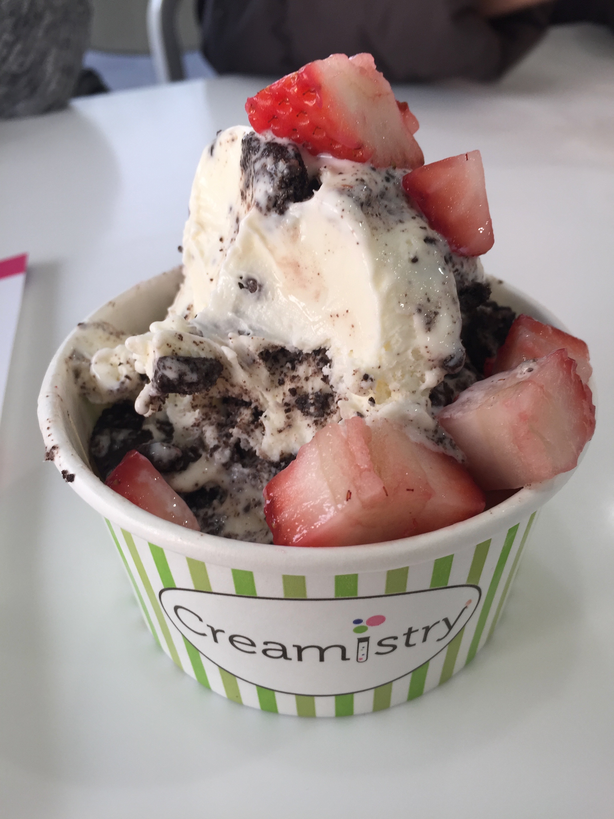 Monday April 1, 2019. Creamistry. Torrance, Los Angeles. The latest ice cream craze sweeping the nation, Creamistry makes each ice cream from scratch using fresh ingredients and liquid nitrogen. You’re able to customize is extensively, from the dairy or non-dairy base to the toppings and mix-ins. They have some signature creations for those that can’t make up their mind. I got their signature premium base with cookies and cream mix-in and fresh strawberries on top. It takes about five minutes for a “Creamologist” to make an ice cream (they had about five machines running at once) and the selections are priced a bit higher than the other already expensive ice cream shops I tend to visit. It was quite good—I’d even say above average. To some extent, it felt a bit gimmicky, but the custom, made on-the-spot ice cream turned out to be surprisingly good.