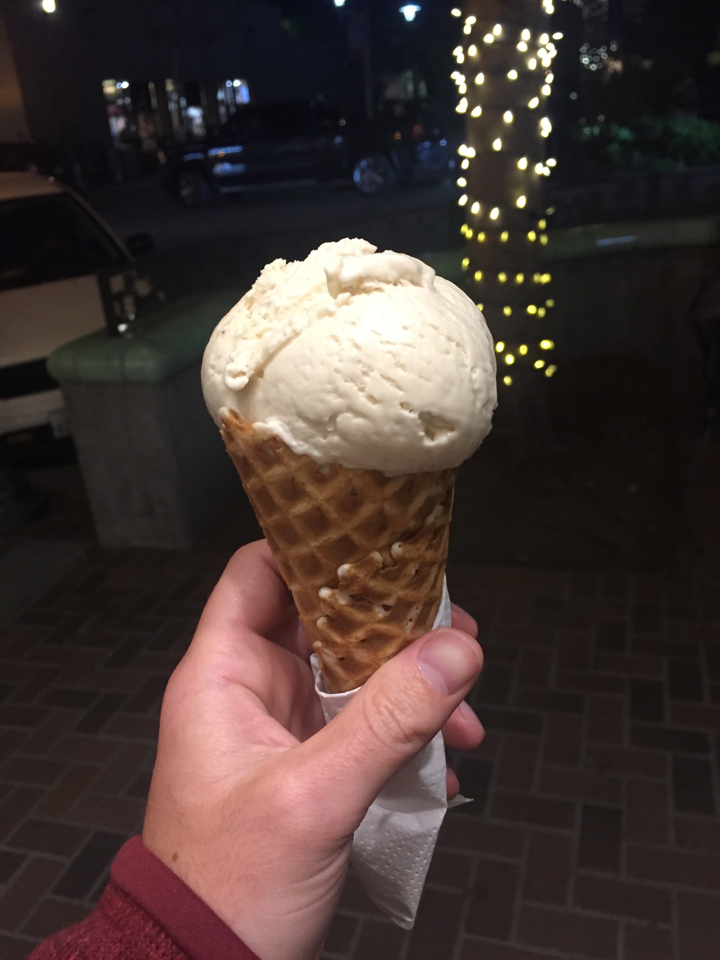 Sunday April 7, 2019. Scoop Microcreamery. Palo Alto. Forsaking a delicious ice cream sandwich from CREAM (my ice cream of choice last time I was in Palo Alto) instead I went to Scoop to try something now. I got a scoop of brown sugar banana in a cone and ate it too quickly to determine how good it was.