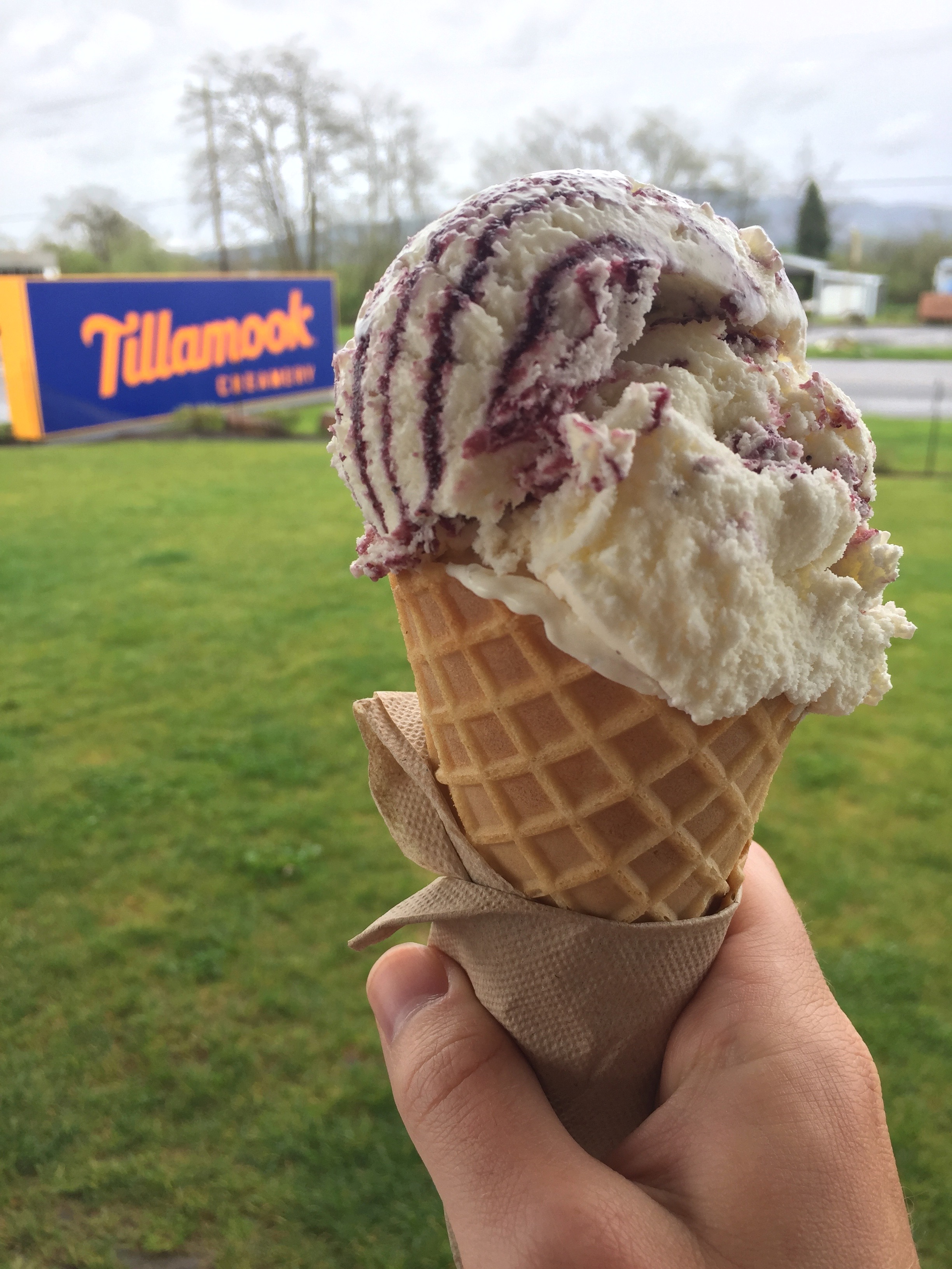 Sunday April 14, 2019. Tillamook Creamery. Tillamook, Oregon. On my way to Portland, I stopped by Tillamook Creamery for a tour and lunch. Tillamook is a large dairy processor in the region that makes ice cream, yogurt, and primarily cheese. It’s found in grocery stores and is not generally considered a premium brand—though certainly not a sub-par brand either. Upon my visit, I was struck by the blandness of the cheddars. I was expecting something like Grafton Village Cheese Company in Vermont, which I visited last winter and was supremely impressed with their samplings. Tillamook, however, is a much larger facility, as demonstrated by the massive crowds visiting on that Sunday. After getting a grilled cheese and tomato soup (the cheeses cooking into the meal were significantly better than the samples), I got a scoop of Huckleberry Swirl in a cone. Though I have often found that fruit flavored ice creams are harder to get as smooth, the delightful flavor overcame any consistency issues.