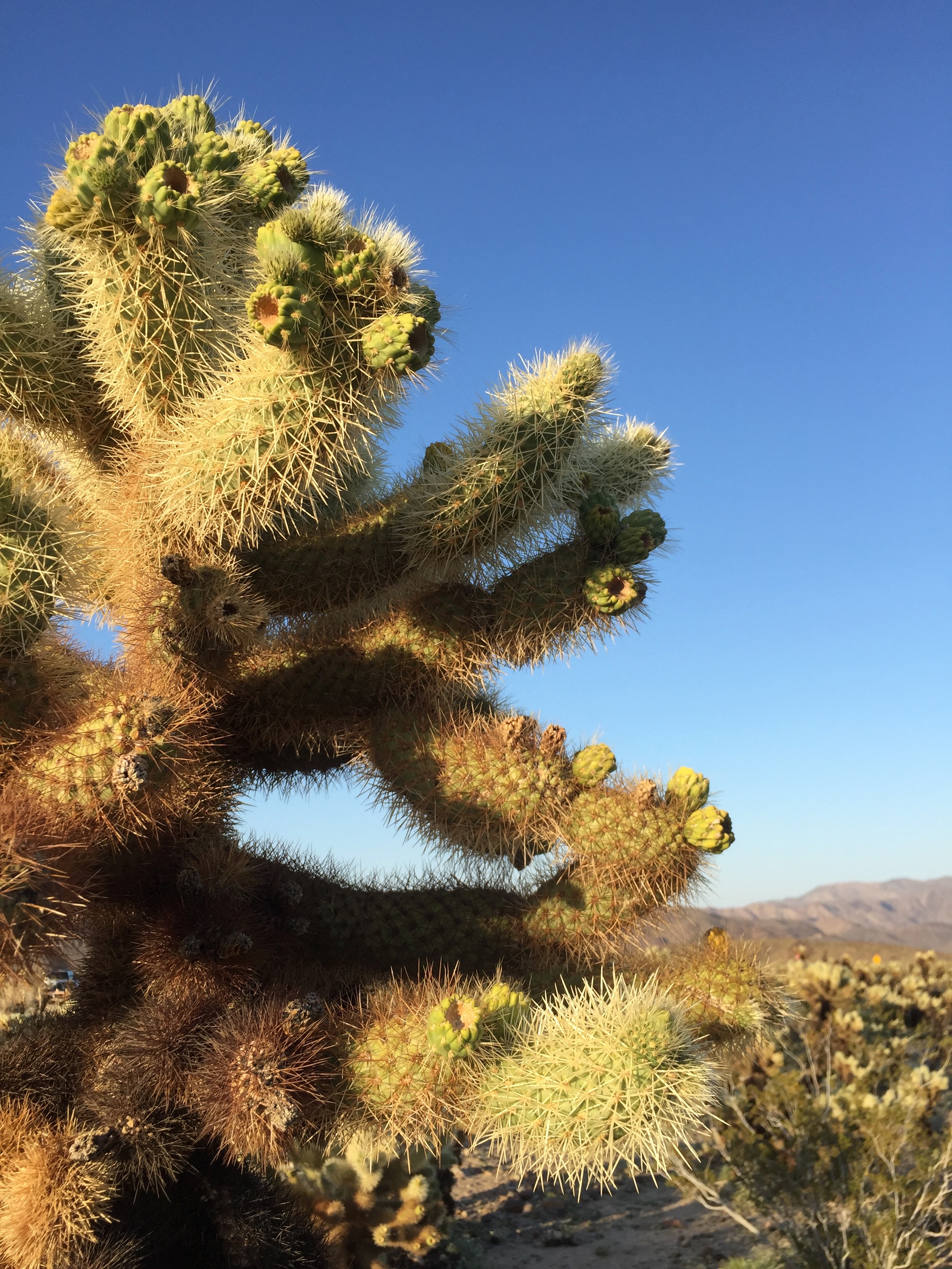 After mistakenly getting lunch at The Palms Café instead of Palm Greens Café (it was pretty good, though not what we expected) and getting groceries at the local Whole Foods (plus a fresh fruit smoothie since I was a zombie having been up for twelve hours since 3:30am) we made our way to Joshua Tree. Around the corner from our Airbnb on the way to dinner, I came across this wonderful little cactus plant, shown below. It was a mesmerizing plant, so I took a picture. I later learned that it is the Teddy Bear Cholla (pronounced “choy-ya”) Cactus, but more on them later.